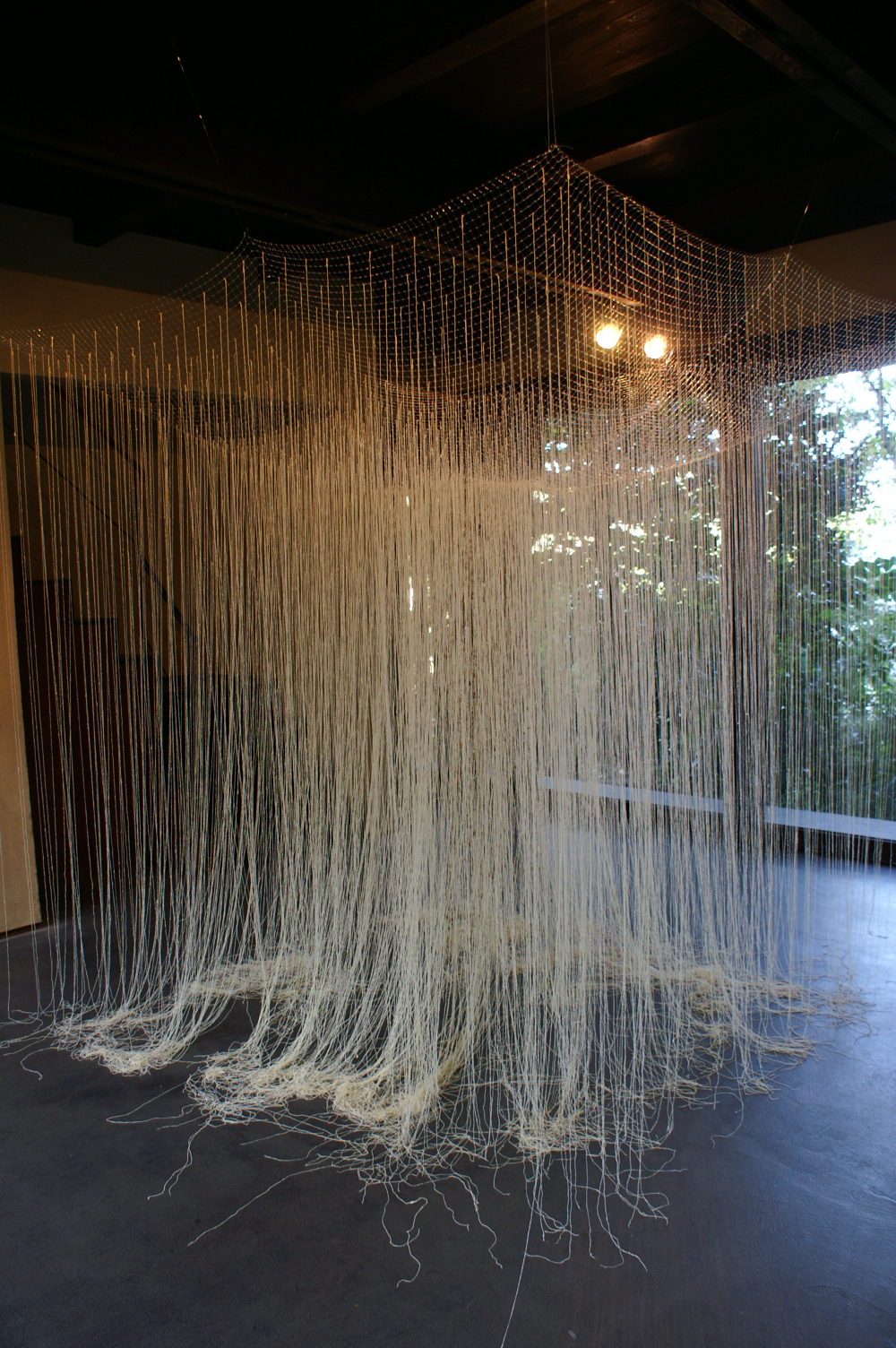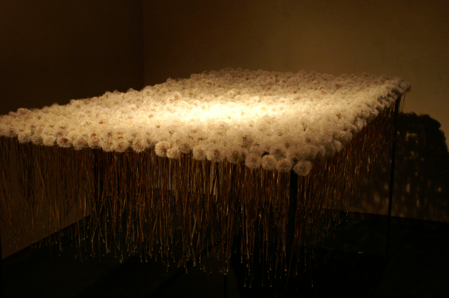 明の部屋にはみつろうをまとった糸2000本が、植物の気根のように天井から垂れている。暗の部屋には1300本のタンポポの綿毛が夢を誘うように敷かれ、床に黒いアクリル板が敷かれ、覗き込むと綿毛と茎とみつろうのしずくが写りこみ、深い心の記憶の底を思わせます。